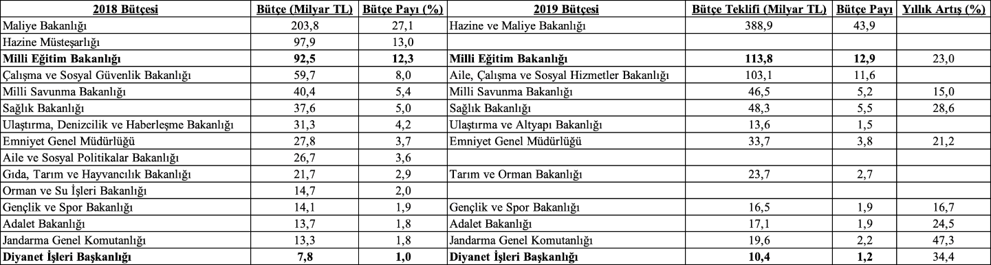 2018 bütçesinde Millî Eğitim Bakanlığı’na 92,5 milyar TL bütçe ayrılmış, ki bu genel bütçeli kurumlara ayrılan toplam bütçenin yüzde 12,3’ünü oluşturuyordu. 2019 bütçe teklifinde bu miktar 113,8 milyar TL’ye çıkmış durumda, oransal olarak bu miktar toplam bütçede binde 6’lık artışla %12,9’a tekabül ediyor. Yıllık artış oranı ise %23. Diyanet İşleri Başkanlığı’nın bütçesi ise 7,7 milyar TL’den 10,4 milyar TL’ye çıktı. Bütçe payındaki oranı %1’den %1,2’ye yükselse de yıllık artış oranı %34’ü aşıyor.
